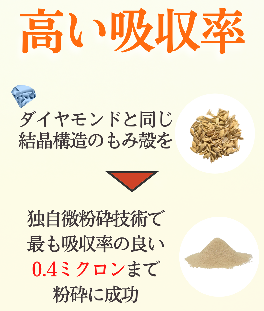 原材料にいくら良いものを使っていたとしても、粒度の大きいもみ殻ではカラダの隅々まで行き渡りません。
