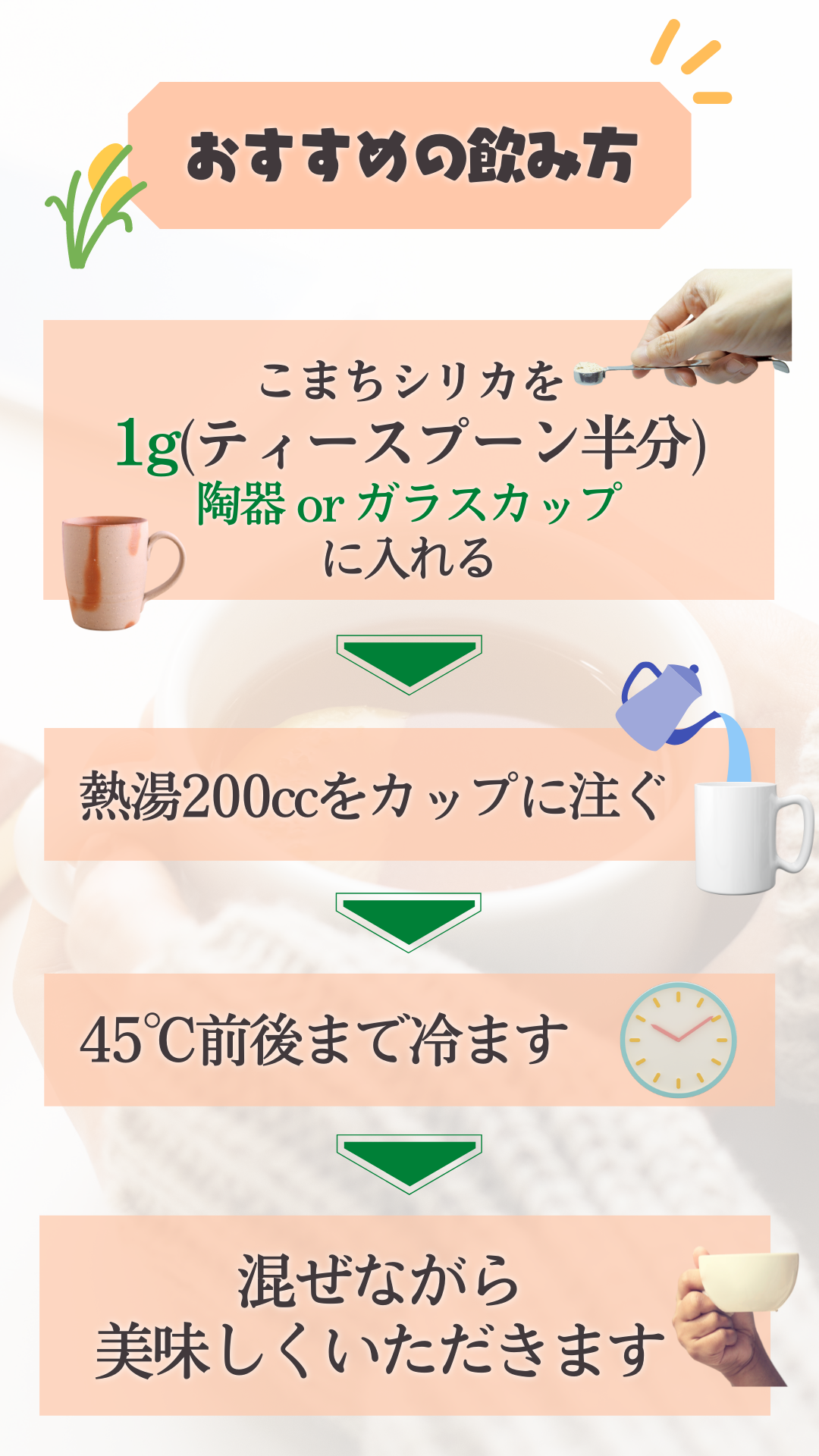 ・1日1gを目安に日に1~2回、熱湯に溶いて45℃前後でお召し上がりください。