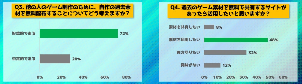 「ゲーム制作をして沢山の素材を作ったけど、一度ゲームが完成してしまったので作った素材はハードディスクの中に眠ったまま……」というゲーム制作者の方々には「ゲーム素材が他の人の作品で生き返る」機会を提供し、「ゲーム制作をしたいけど、あまりコストをかけられない……」という方々には他のゲーム制作者の方が提供した「ゲーム素材を無償で取得する」ことができるWEBプラットフォームを作りたいと考えています。(アンケート結果は以下の通り)