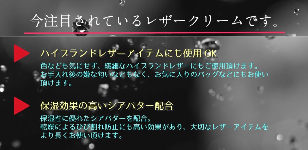 保湿性に優れたシアバターを配合しており、皮革の潤いを長く持続できる製品です。
