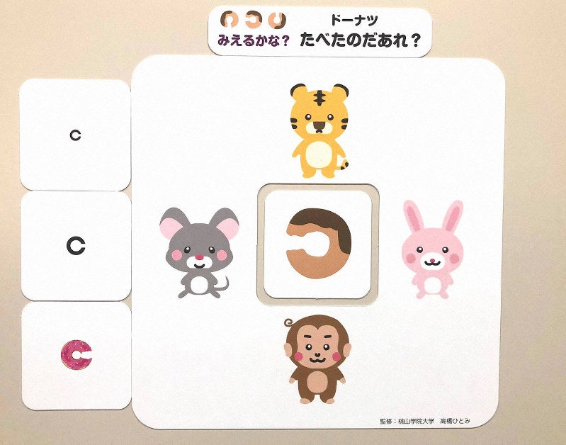 引き続き、幼児がクイズ遊びを楽しみながら視力検査に興味を持つ マグネット「みえるかな? ドーナツたべたのだあれ」を作りました。