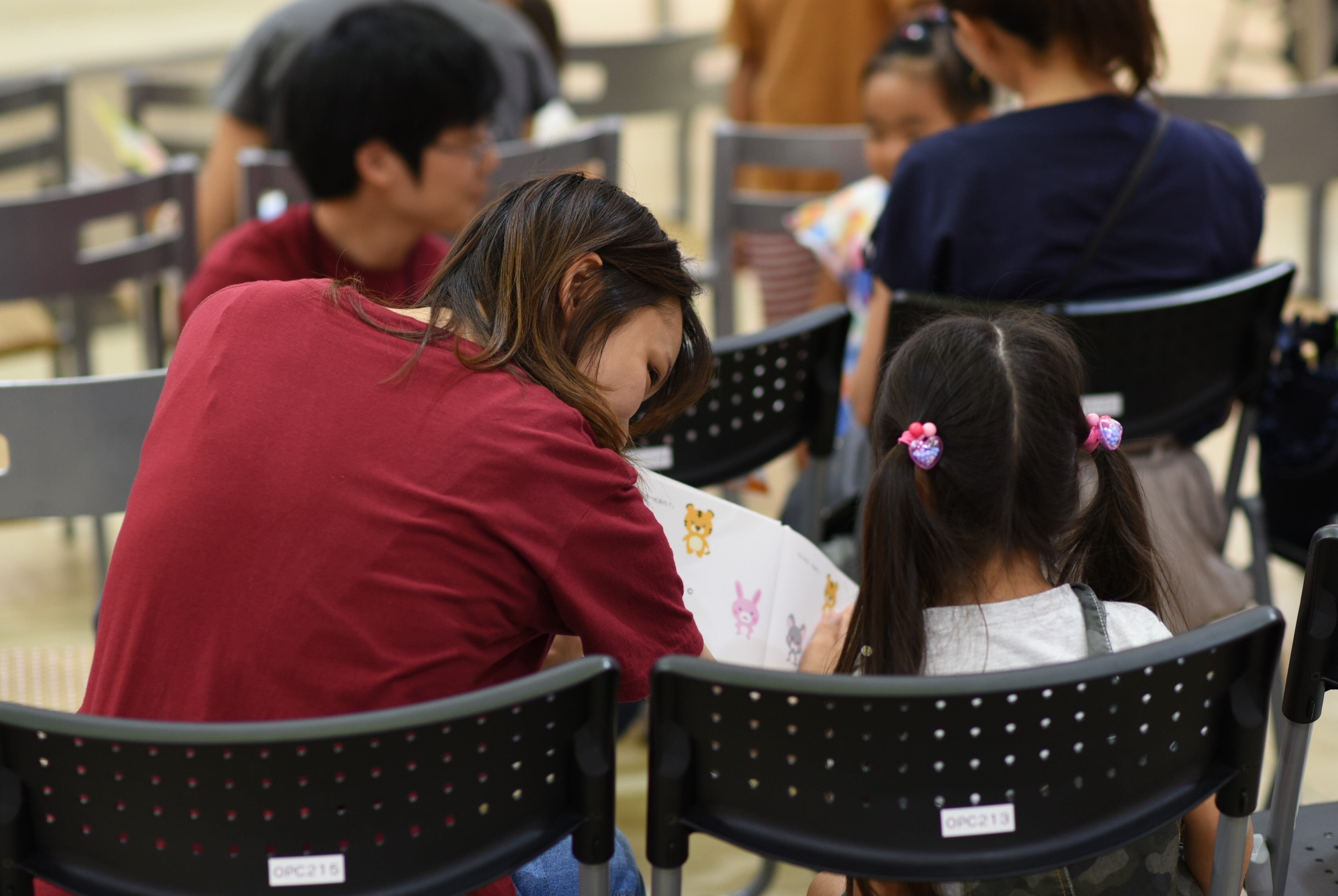 視力検査を待つ幼児が絵本で「たべたのだあれ?」クイズ遊び