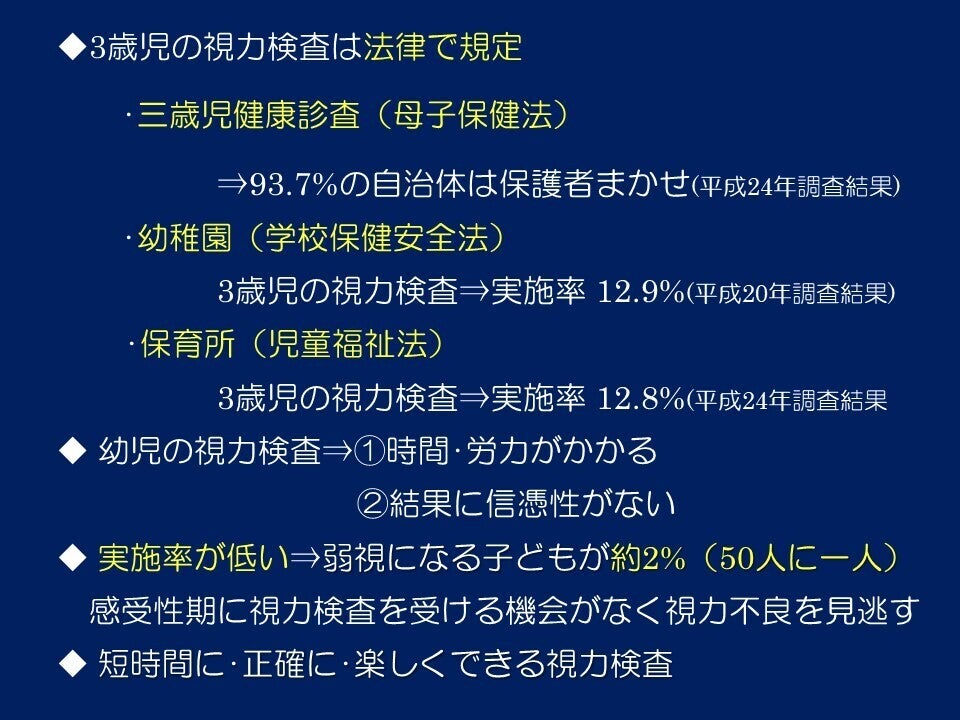しかし、幼児の視力検査は「時間がかかり、結果が正確でない」等の理由で、実施率が低いのです。