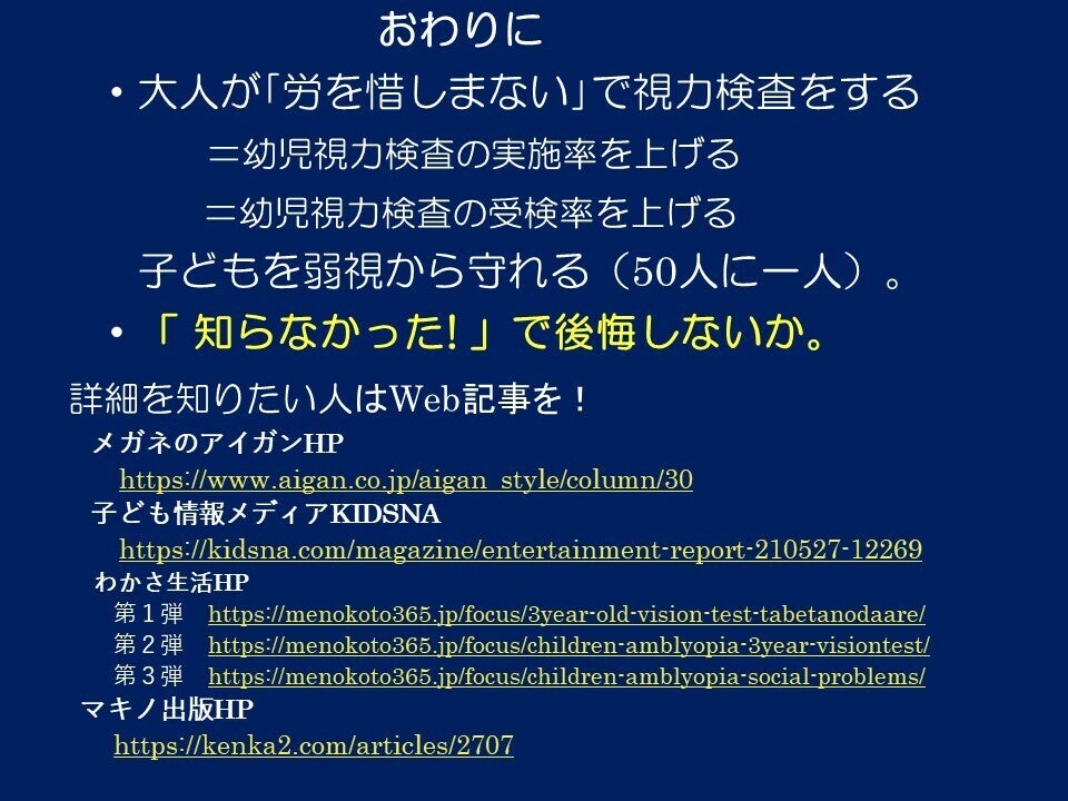 それが、園や施設や自治体での「3歳児の視力検査実施」に繋がり、「子どもを弱視から守る」のが最終目的です。