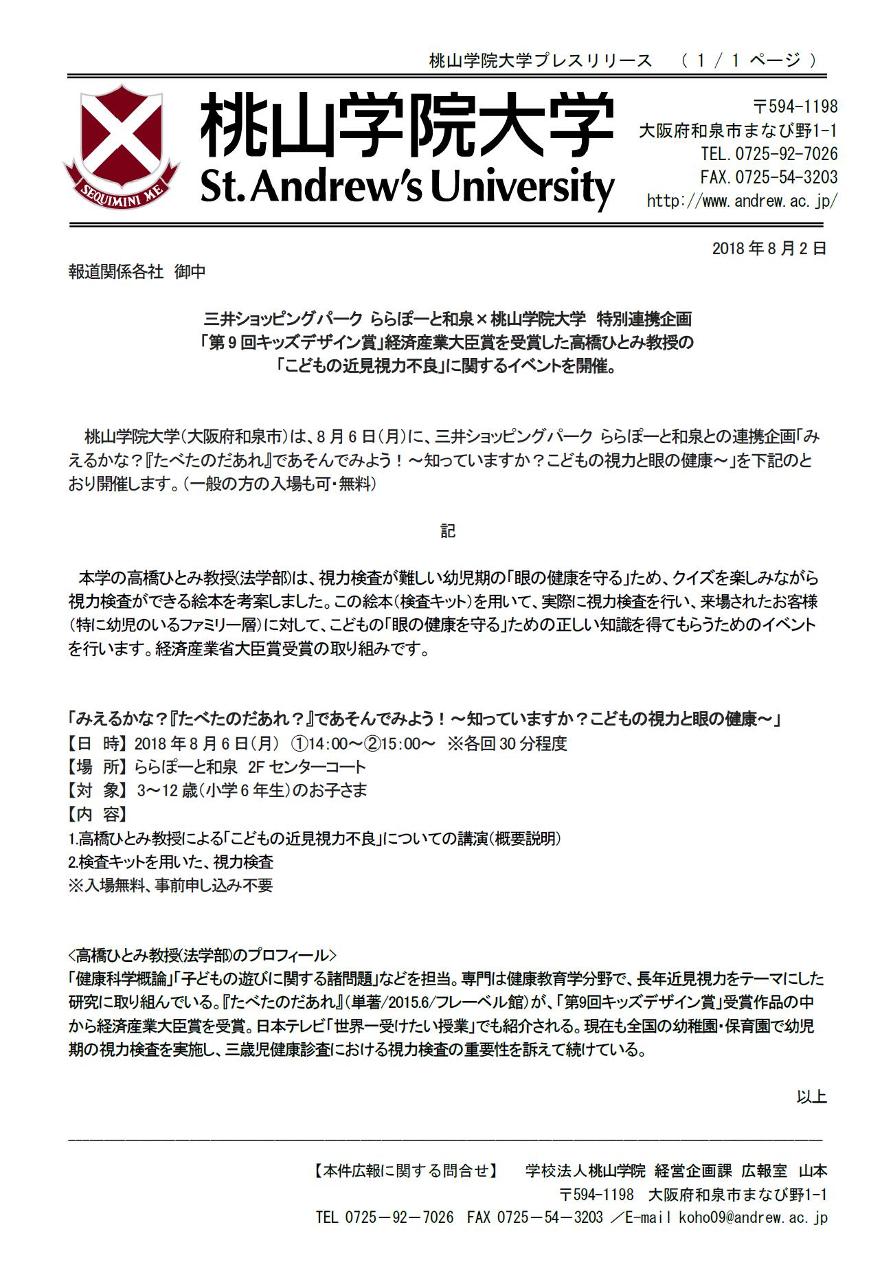 和泉市HPの「和泉市を元気にするアイデア(平成30年度アイデア8)」に「視力検査の重要性」として掲載されています。(以下、原文です)