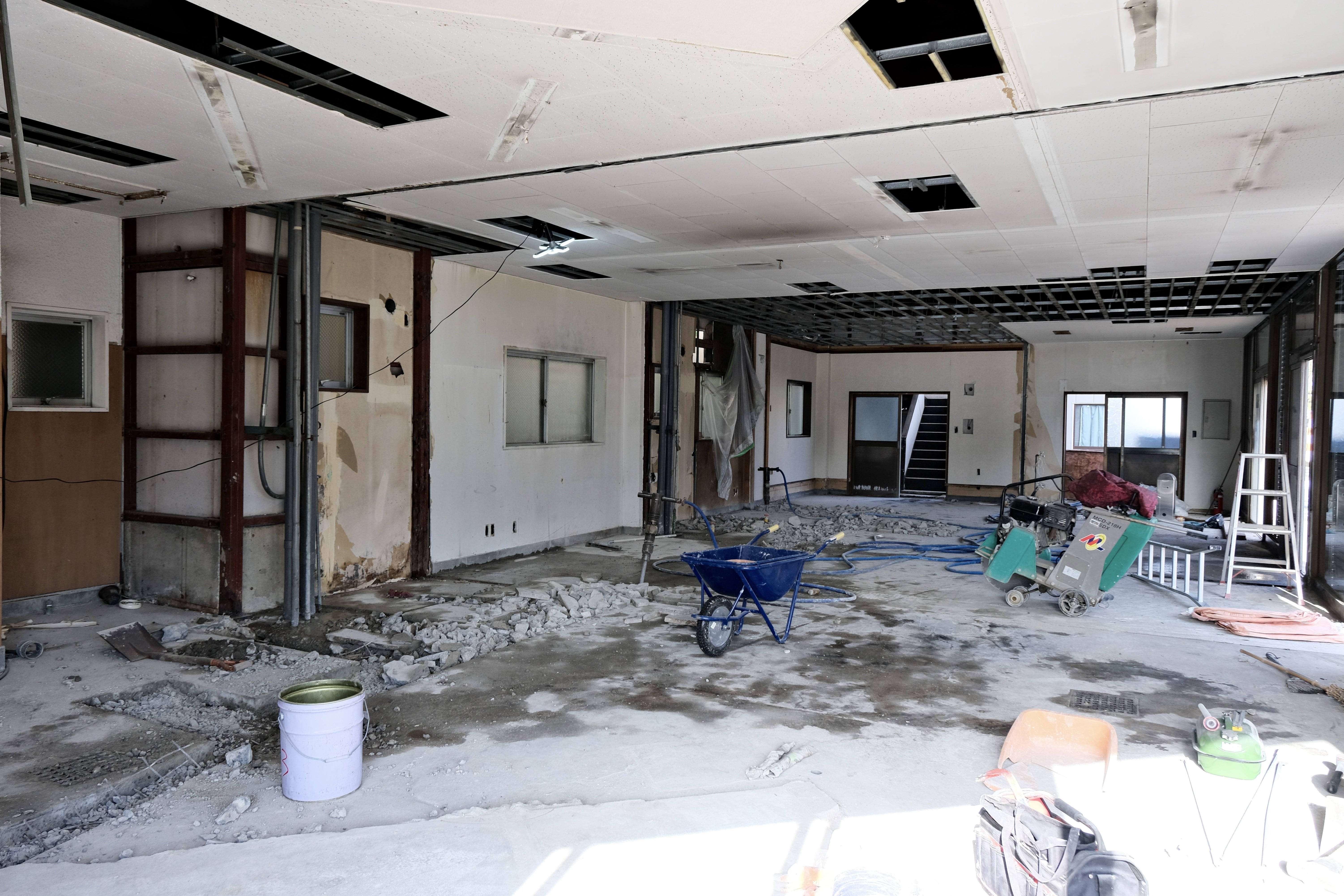 現時点で外観の大きな変化はありませんが、建物内は天井と床、壁が段々と壊され始め骨組みが露わに。