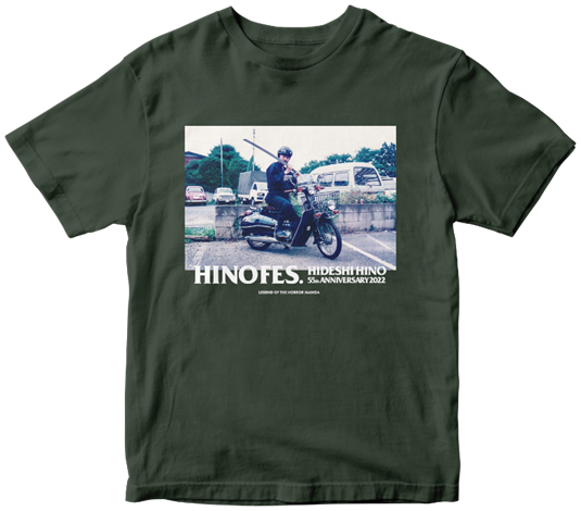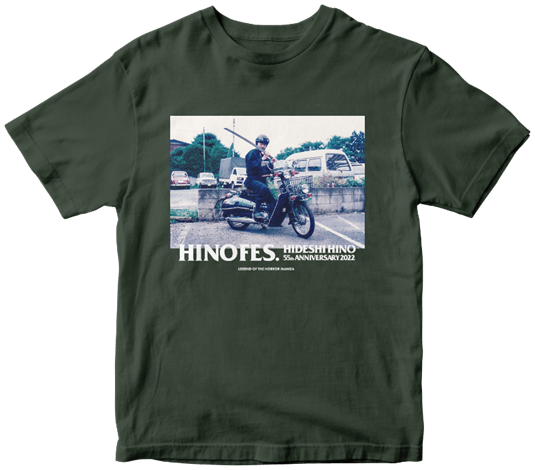 日野先生のプライベート写真(1995年撮影)がプリントされたTシャツ(フォレストグリーン)です。黒地にモノクロもございます。
