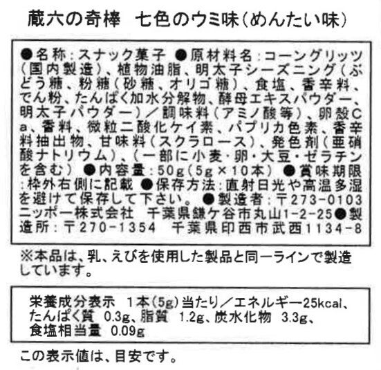 ●スナック菓子 『蔵六の奇棒』(七色のウミ味=めんたい味)10本入り1袋