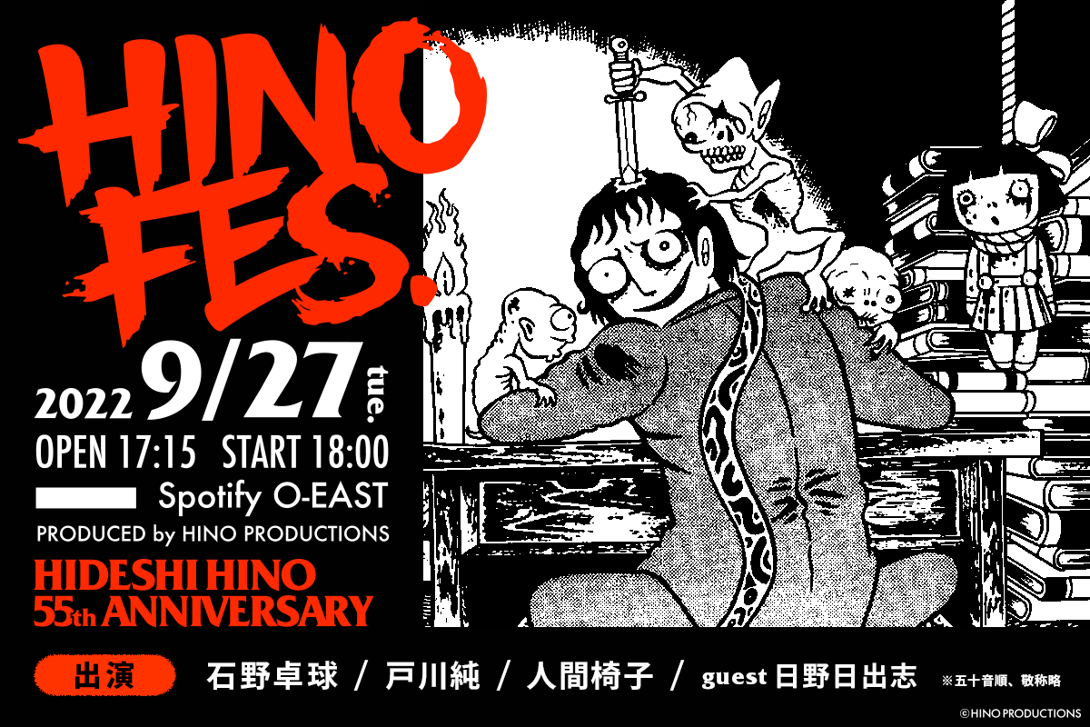 本プロジェクトに関心を持っていただきましてありがとうございます。日野プロダクション代表の寺井と申します。日野日出志先生が1967年のデビューから今年(2022年)8月で画業55周年を迎えられます。55周年を記念して日野先生を敬愛する3組のアーティスト(石野卓球さん、戸川純さん、人間椅子さん)をゲストにお迎えして「日野フェス」という音楽祭をSpotify O-EAST(渋谷)にて9月27日(火)に開催いたします。
