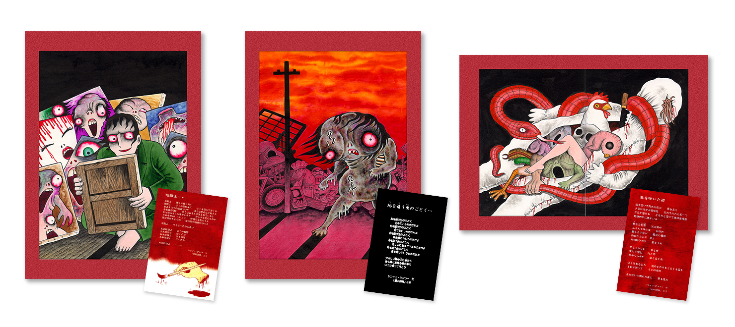 ● 「地獄詩集」三部作(地獄変、地獄少女、赤い蛇)ペーパーフレーム入りA4複製原画3点(日野先生の直筆サイン入り、地獄詩集ポストカード3枚付)セット