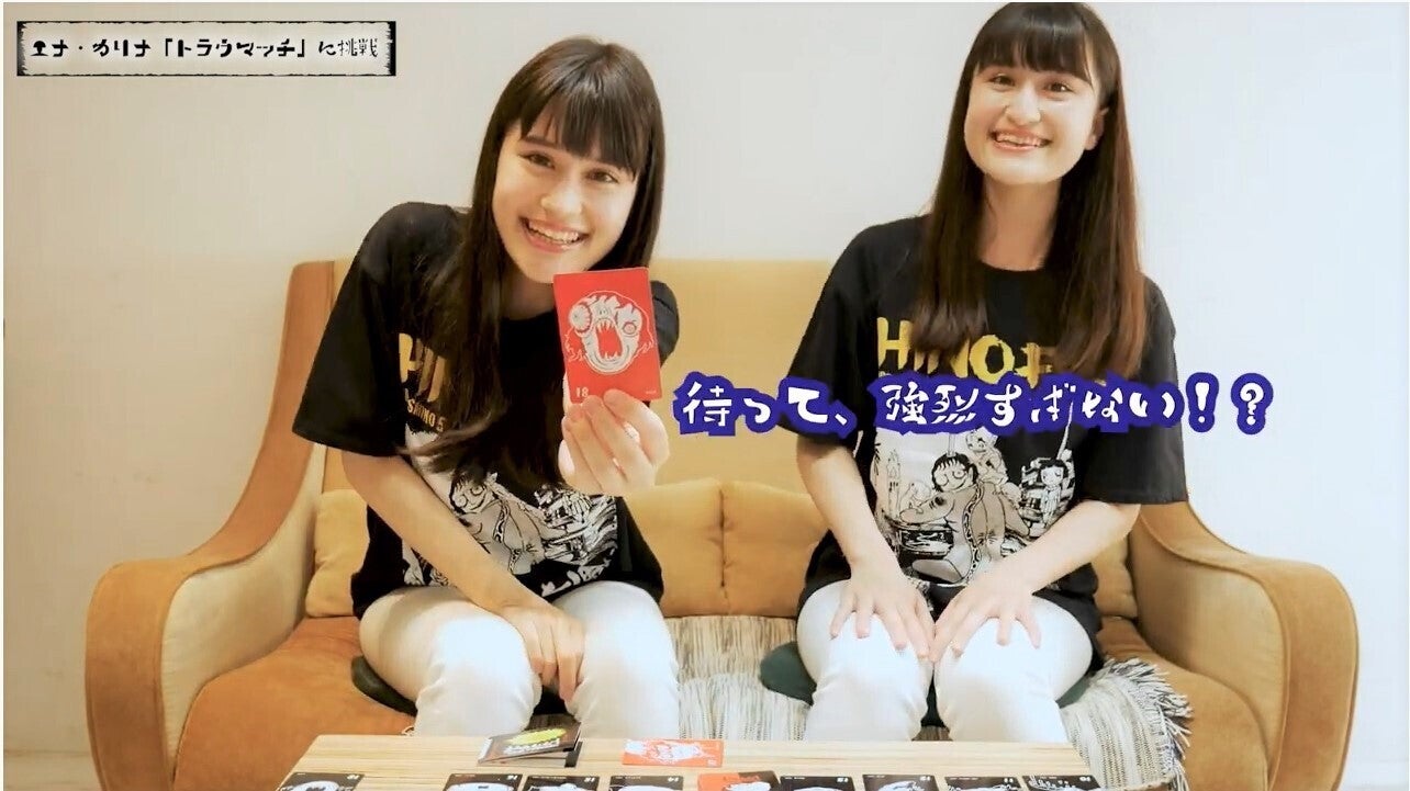 ご支援いただいた皆様、本当にありがとうございます。カードゲーム「日野日出志のトラウマッチ」に双子ハーフタレント西咲エナさん・カリナさんに挑戦していただきました。相手の表情を見ておでこのカードに描かれた表情を当てるカードゲームです。美しいお二人のお顔の表情筋が崩壊し、あわや放送事故寸前・・・日野作品のキャラクターは人間には不可能な表情も数多くございます。10回連続当てたら成功、途中で「きみが死ぬ番だ!」のOUTカードが出たらゲームオーバーです。OUTカードが出たら「今までの表情筋、返してくれ!」となりそうです。表情筋の準備体操を入念におこなった上で是非トライしてみて下さい。100部限定生産の超貴重なアイテムです。西咲エナさん:https://twitter.com/ena_nishizaki西咲カリナさん:https://twitter.com/ka_nishizaki