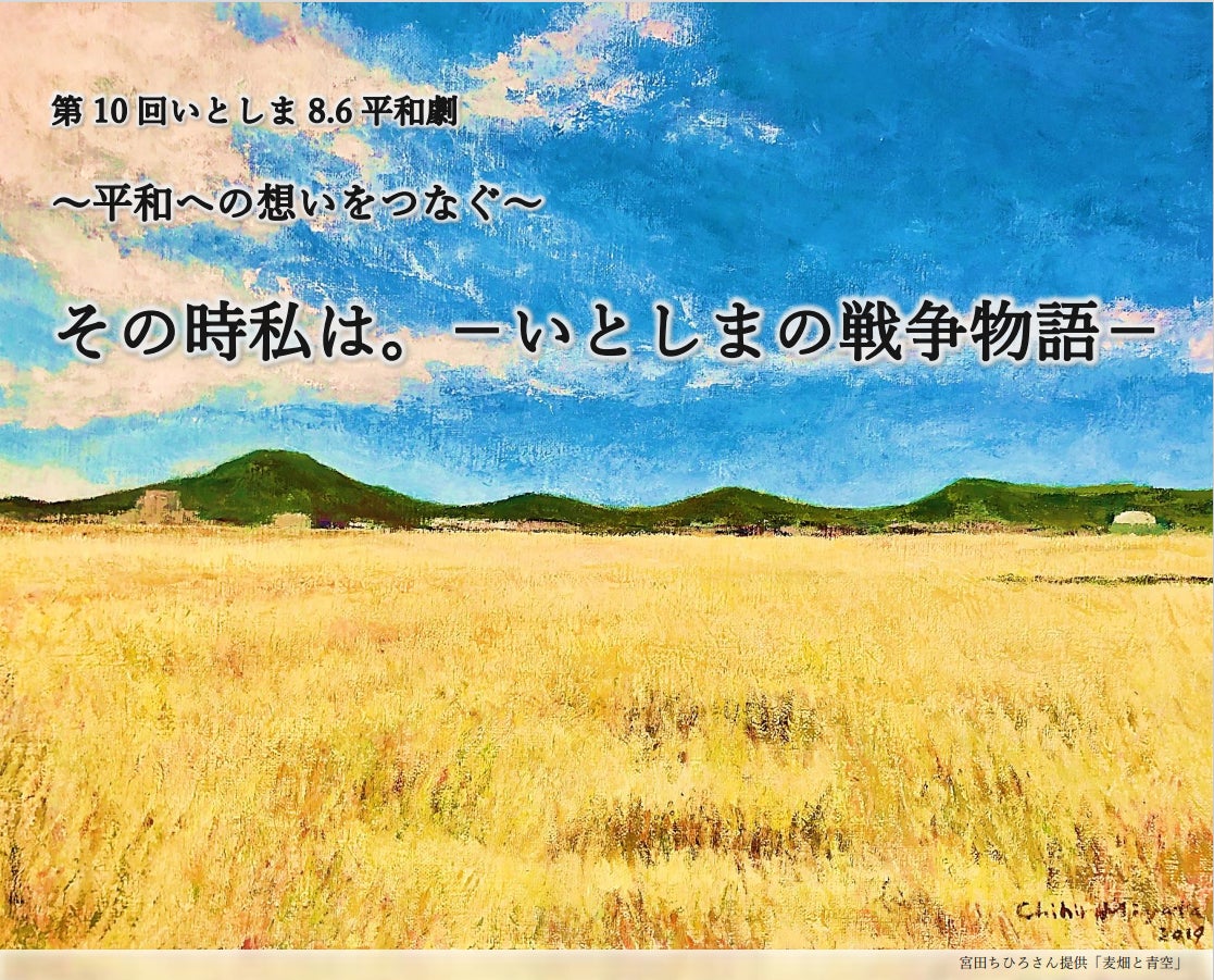 今回の平和劇のイメージ画像として、糸島を代表する画家宮田ちひろさんの「麦畑と青空」を使わせていただいています。みなさんご承知の通り、ウクライナの各地で起こっている戦闘、心が痛みます。ウクライナの国旗は「空の青と麦の黄色」なんだそうです。ウクライナも麦の産地、糸島と似た風景が広がっているのではないか?そんな時、ちひろさんのこの絵を思い出しました。ウクライナ情勢と重なって、私たちから行動できる一歩として何かできないかと考えました。ちひろさんもぜひ活用してくださいと、快諾してくださいました。今回の平和劇を通しての隠れたメッセージと祈りです。