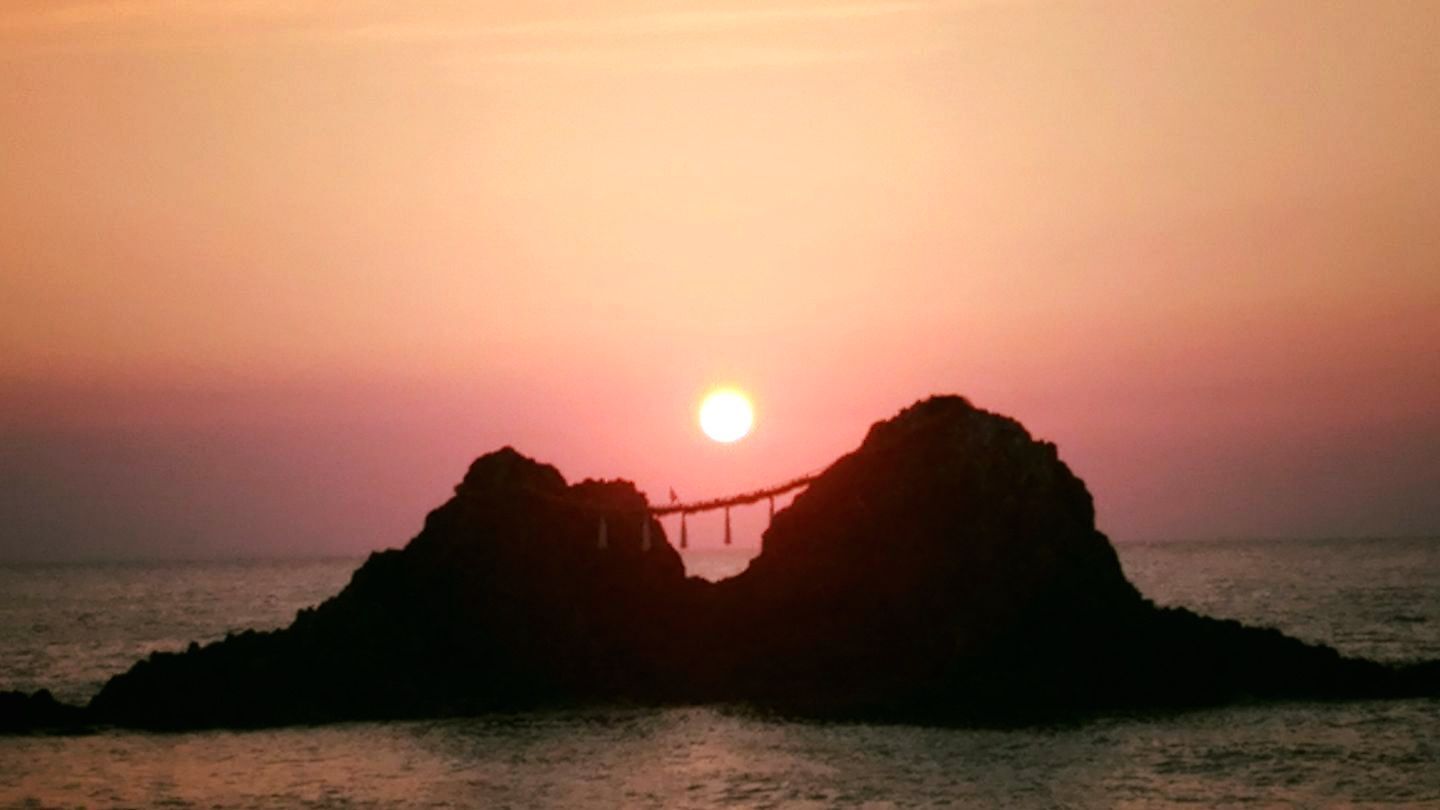 夏至には夫婦岩の真ん中に夕陽が沈む