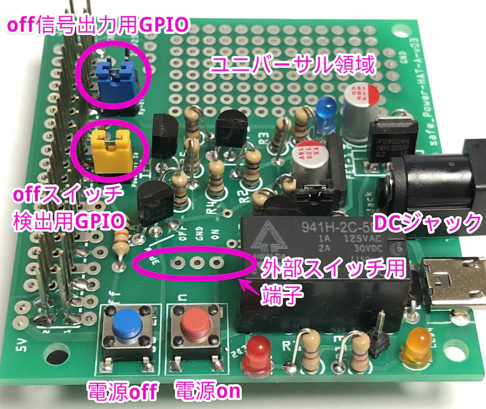 初心者やお子さんにラズパイを使ってもらう時に重宝しますし、使い慣れた人でもいちいちshutdownコマンドを打ち込んで、システム終了を確認して電源を切るのは、何気に面倒です。この基板があれば、スイッチ一つで安全に電源を切ることができます。