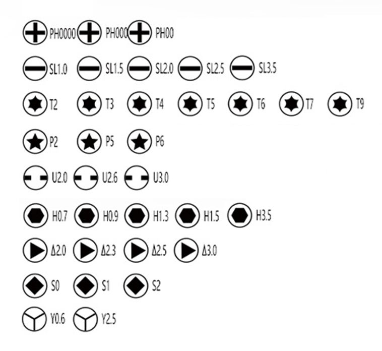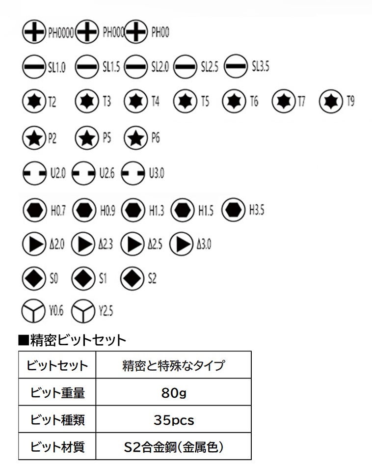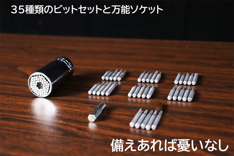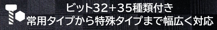 常用の32種類ビットの他に、精密機器や特殊ネジ用などに対応する35種類のビットセットと万能ソケットも付属しています。