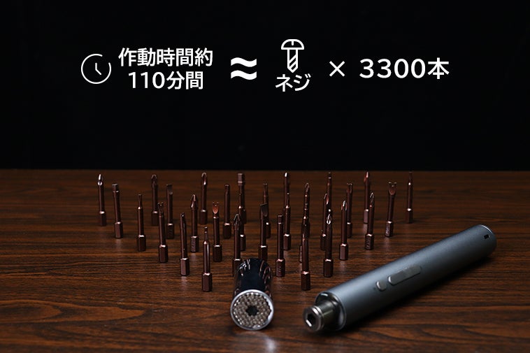 フル充電の場合、空回りで110分間の連続作動可能。また、外せるネジの数に換算すれば、3300本以上利用可能。