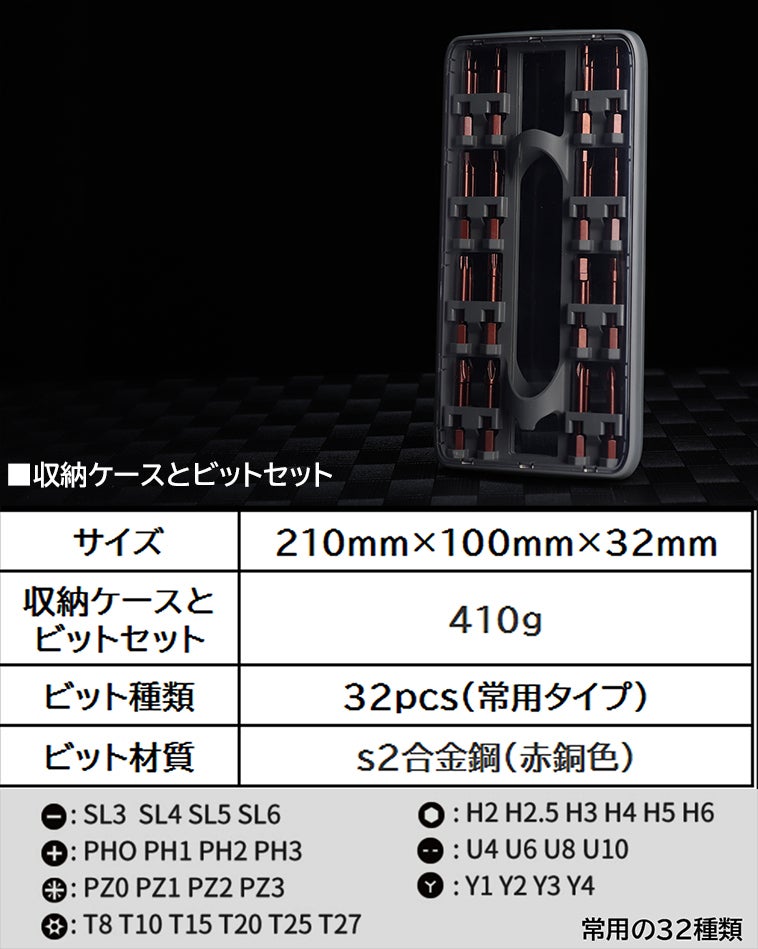 常用のネジに対応する32種類のビットがオールインワンに。