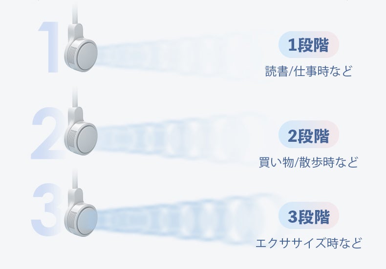 「S64」は3段階の風速調整機能を備えており、電源ボタンを短く押すだけで風速を切り替えられます。事務所で仕事や勉強、また買い物やエクササイズなど、活動内容や暑さに合わせて適切な風速に調整できます。