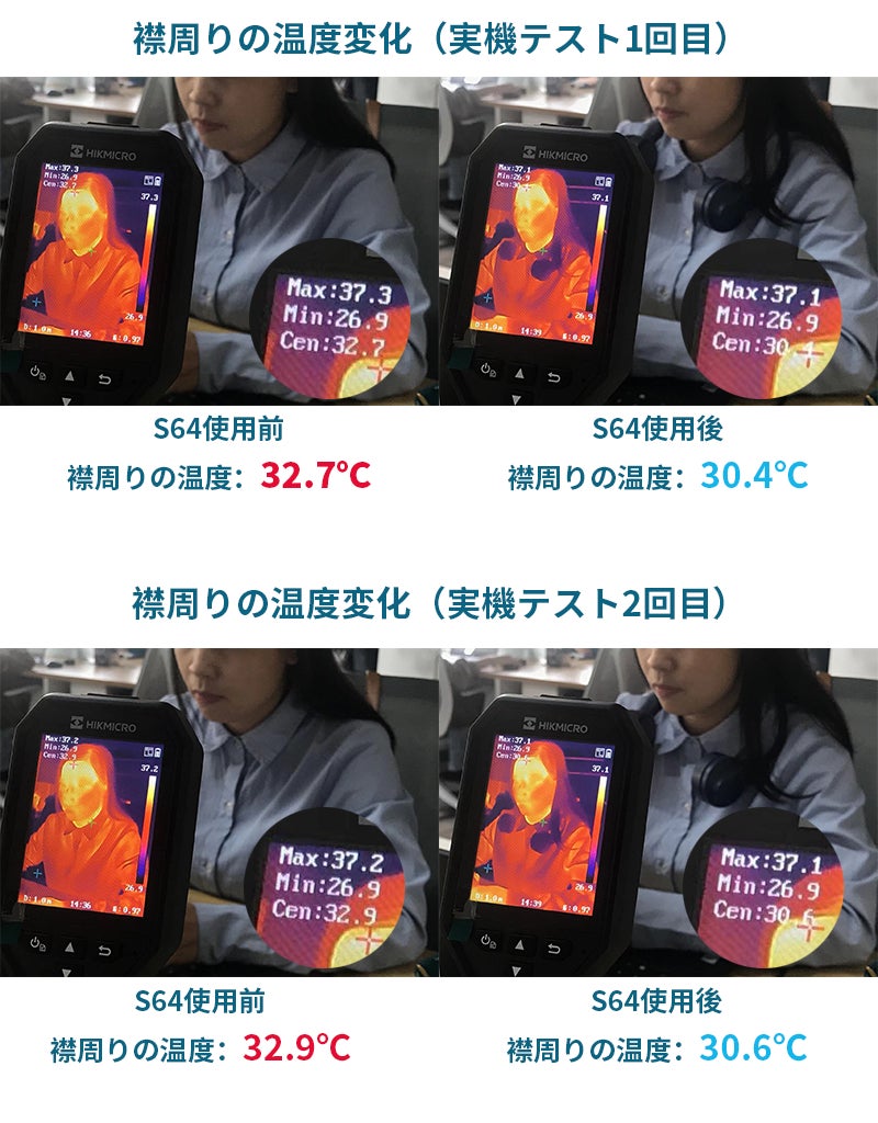 客観的に商品機能を説明するため、専門の測定器にてS64の冷却機能についての検証テストを行いました。