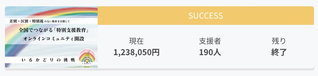 ご支援をありがとうございました。190名というたくさんの方に賛同・ご支援を頂けたこと、心より感謝しております。皆様からのいただいた想いは、大切に活動のために活用させていただきます。安定してコミュニティ運営をすることができることへの感謝の気持ちは、動画配信、ブログ配信、オンライン交流会などの情報提供を通して、想いを伝えることができたらと思います。