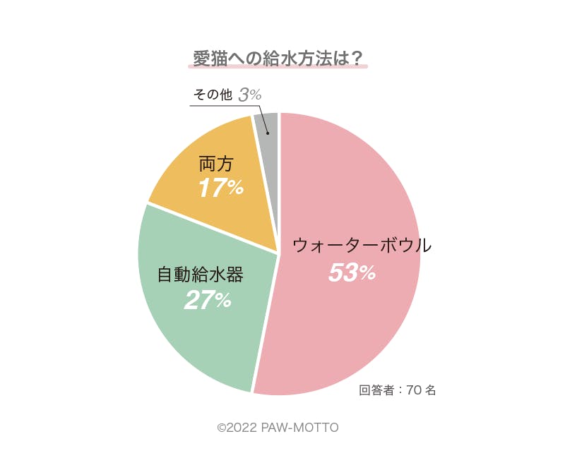 では、ウォーター・ボウル派か、自動給水器派か、世の中のオーナー様はどちらが多いのか。それを知るために、PAW-MOTTOが独自にアンケート調査を行いました。すると、お答えいただいた方のうち、多くがウォーター・ボウルを使用されており、中には自動給水器と両方ご利用の方もおられると分かりました。