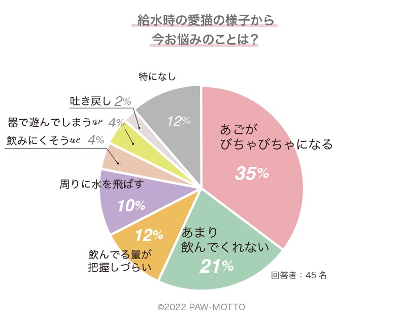 今回のプロジェクト立ち上げにあたり、2022年春にかけて、PAW-MOTTOはSNSを介して愛猫家の皆様にアンケート調査を数回行いました。その結果、鼻ぺちゃ猫さんを中心に、お水を飲む時、「あごをびちゃびちゃにしてしまうことが気になる」とお考えのオーナー様が多い事がわかりました。あごが濡れたままにしていると、場合によってはアクネ(猫ニキビ)ができてしまうという心配もあります。その心配を少しでも軽減できる優しい形を追求する必要性も感じました。