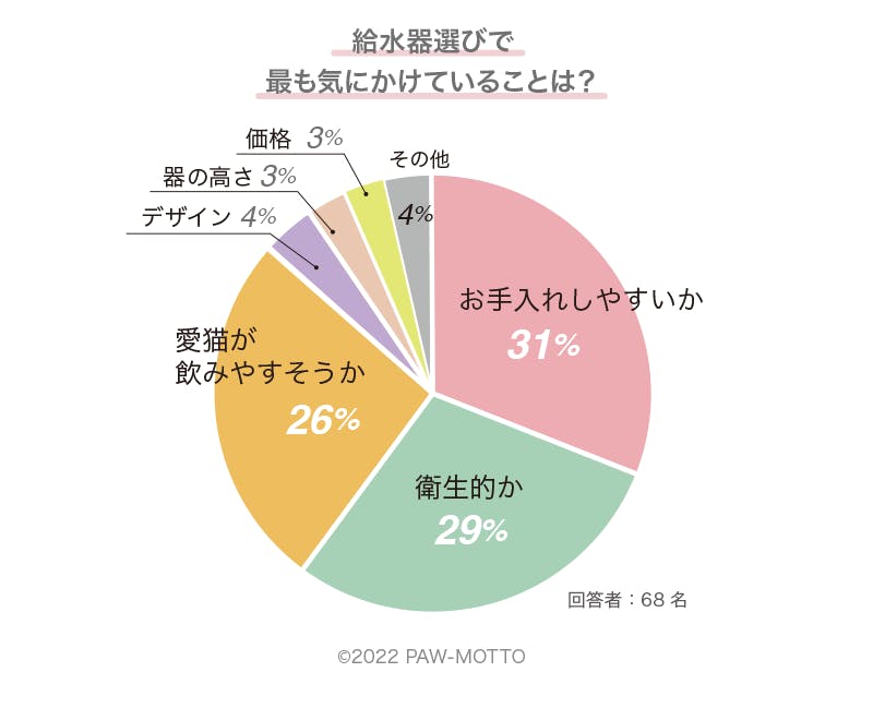 また、給水器を選ぶ際にオーナー様が気にかけておられることをお尋ねしたところ、愛猫が飲みやすいかどうか、衛生的かどうかなど、愛猫ファーストな考えで器を選ぶ方が多く、同時に、お手入れのしやすさも大変多くの方が求めておられることがわかりました。