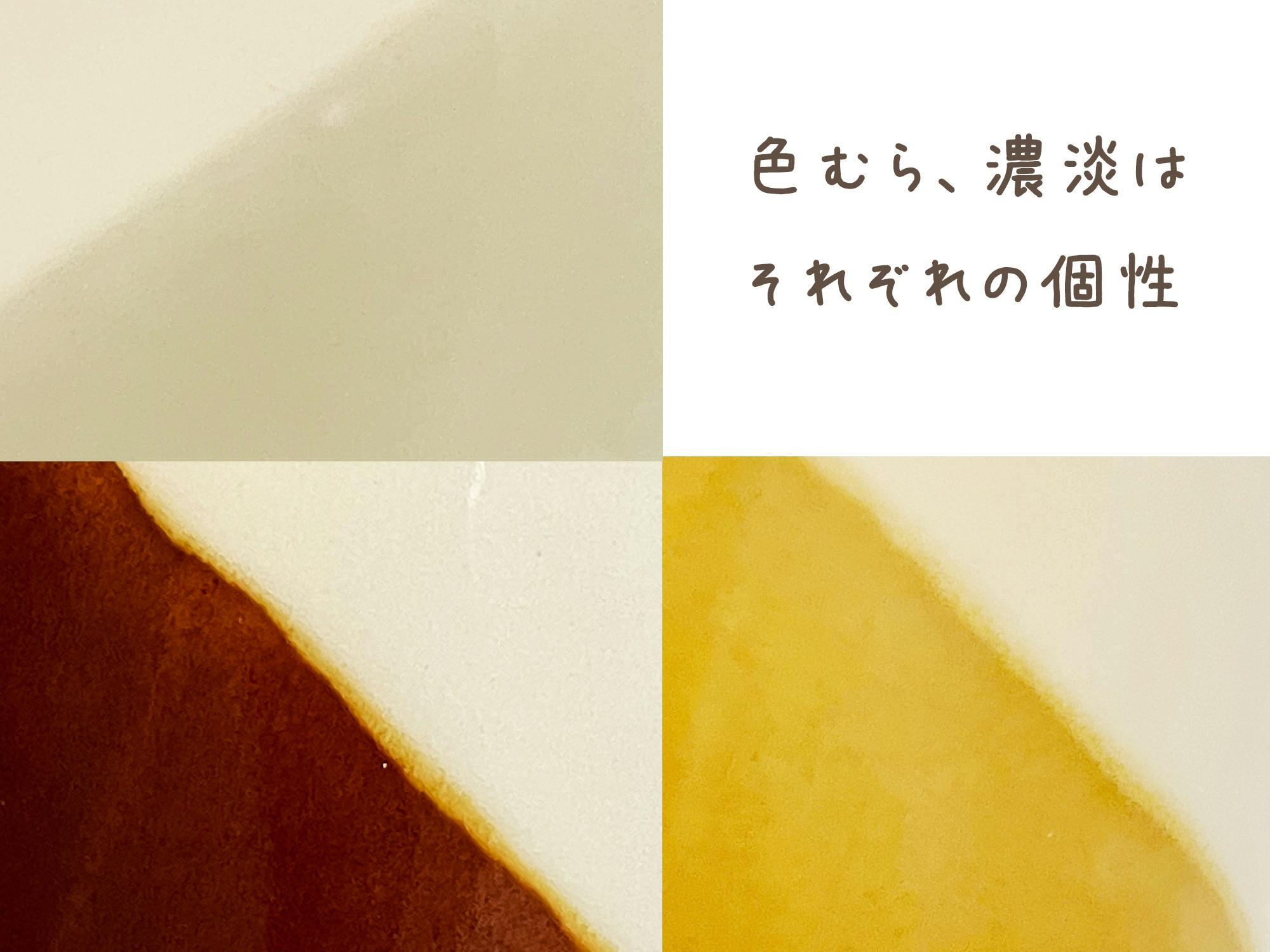 さらに、釉薬の特性上もあり、濃淡などの色むらがみられますが、これは、焼き上げる事で自然に現れるものです。また、土の成分が泥しょうの跡として現れたり、小さな鉄粉が表面に現れることもございます。