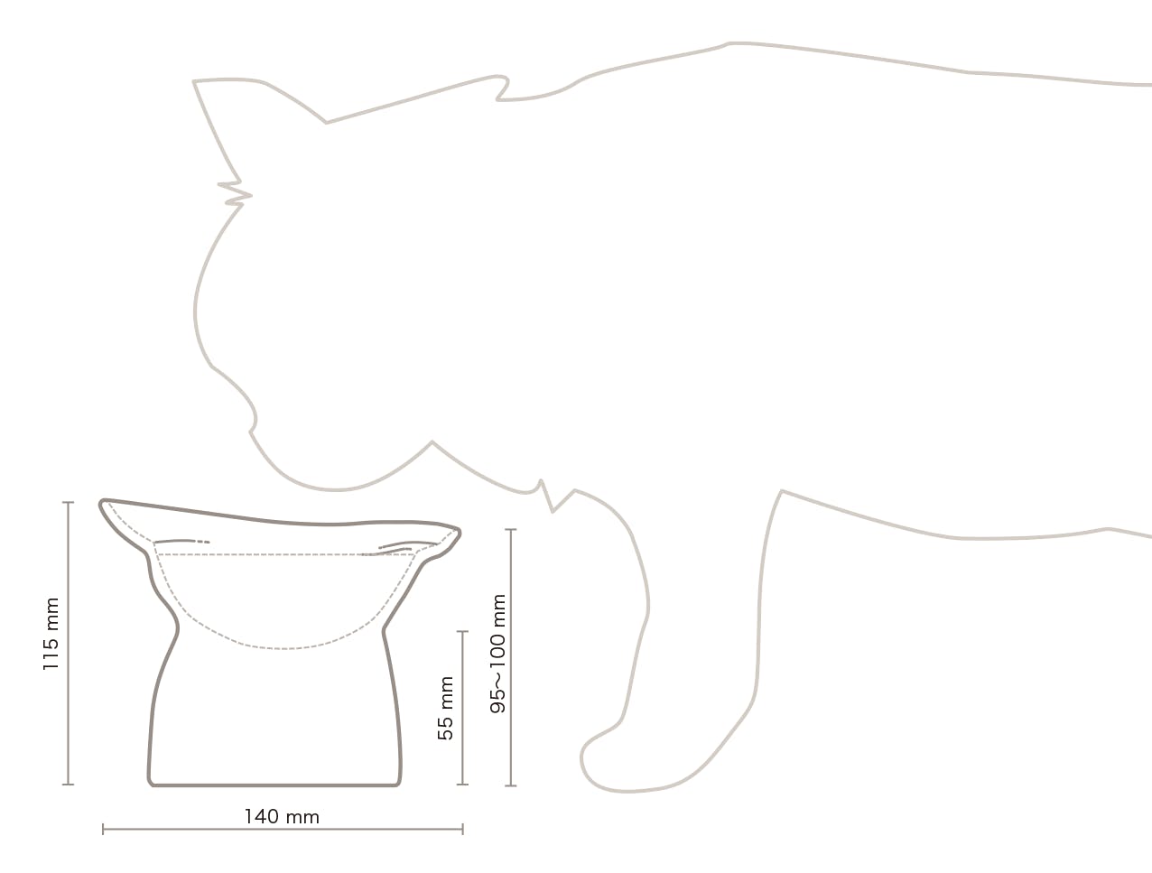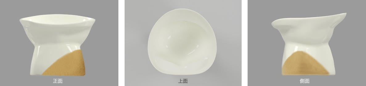 基本の形は(前作のパウ・ボウル ONIGIRIと同じく)やはり角丸三角形。ウォーター・ボウルであっても、髭が縁に当たるストレスを軽減するためには、この形が優しいと判断しました。また、パウ・ボウル ONIGIRIと並べてご利用いただきやすい形状です。