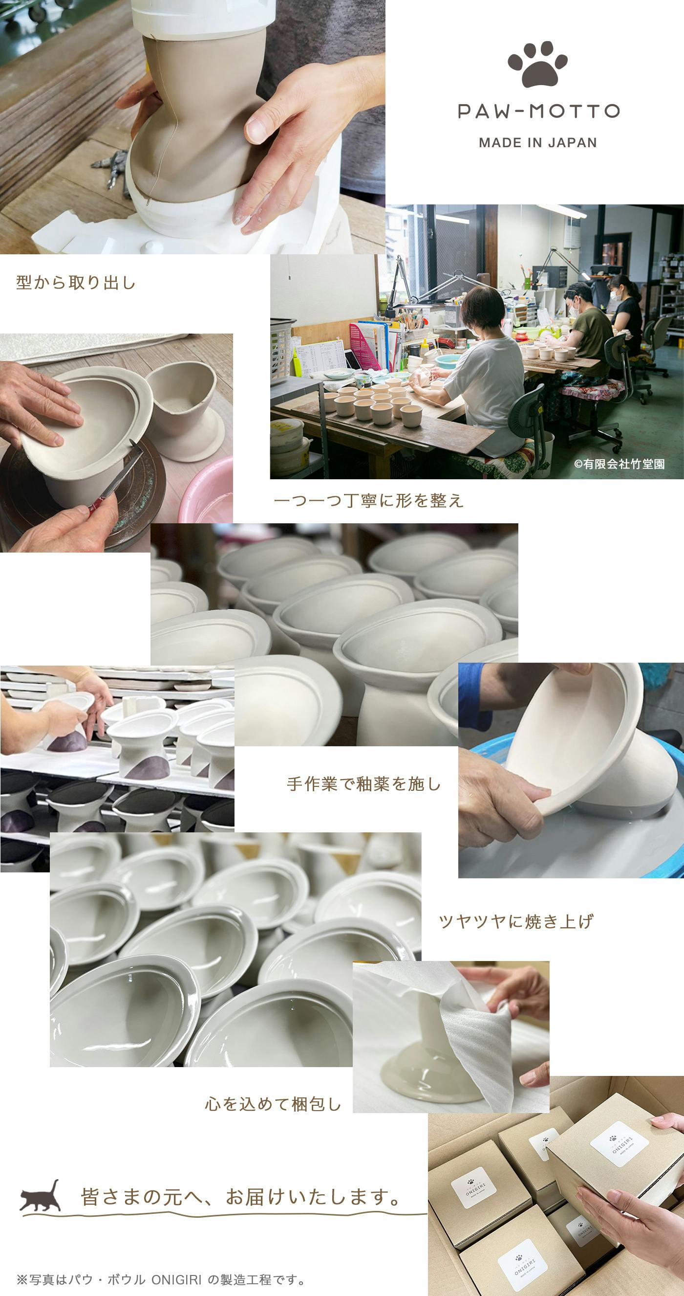 みなさまに品質と衛生面にも安心できる製品をお届けするため、PAW-MOTTOは国内生産にこだわっています。「パウ・ボウル SHIZUKU」は日本製(陶磁器)、人と同じ安全基準をクリア(量産開始後に検査を依頼・実施します)、そして、電子レンジ・食洗機にもご利用いただける高品質な陶磁器です。