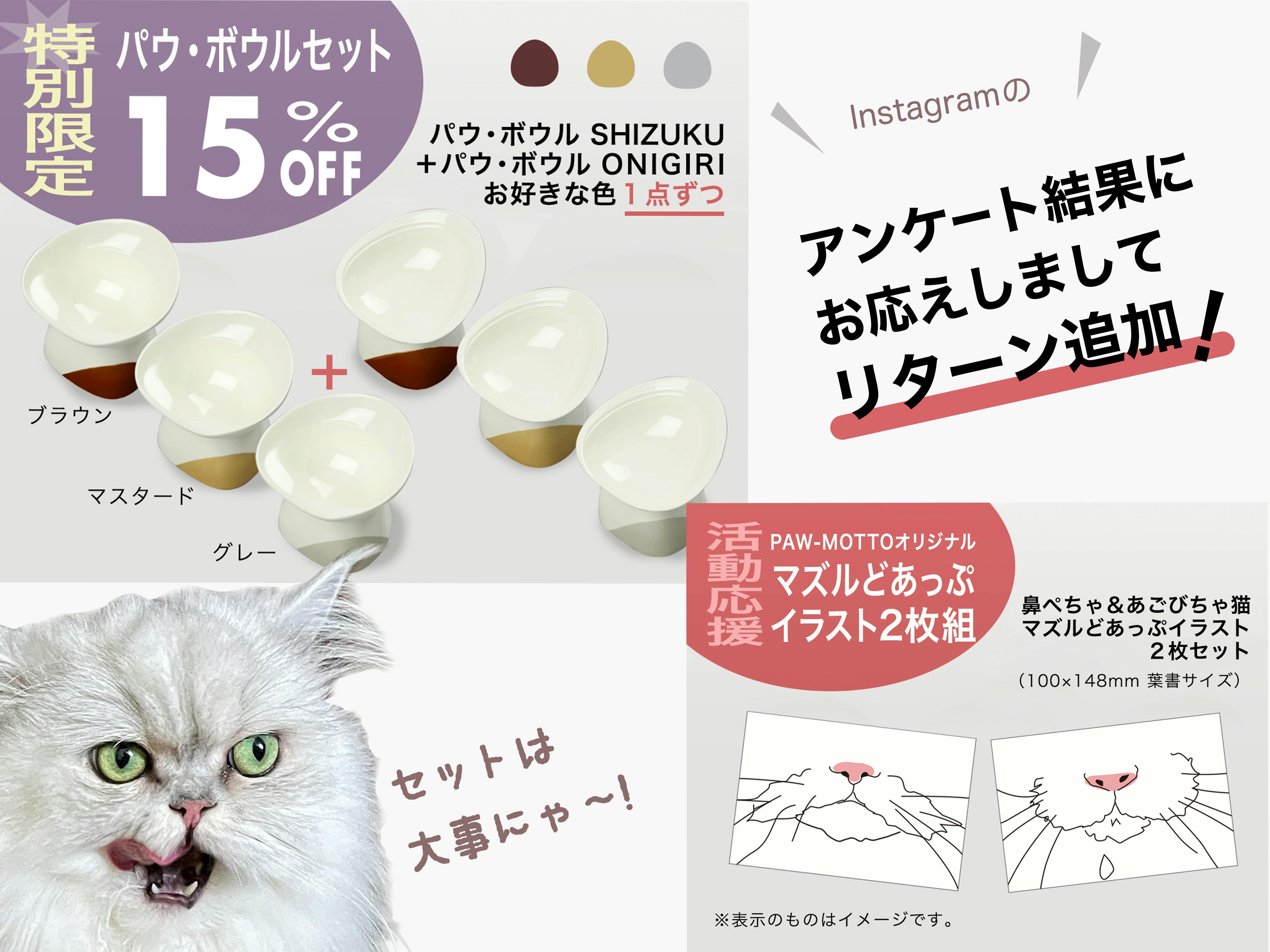 そこで、プロジェクトが無事に成功しましたら、今回のリターン追加より前にご支援いただきました皆さまには、PAW-MOTTOのショップでご利用いただける特別クーポンを発行させていただく予定ですので、その際にぜひご利用ください!
