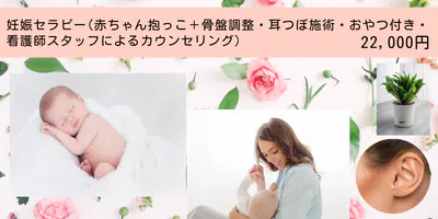 ④ 妊娠セラピー(赤ちゃん抱っこ+骨盤調整、耳つぼ施術、おやつ付き、看護師スタッフによるカウンセ リング):22,000円(10名様)