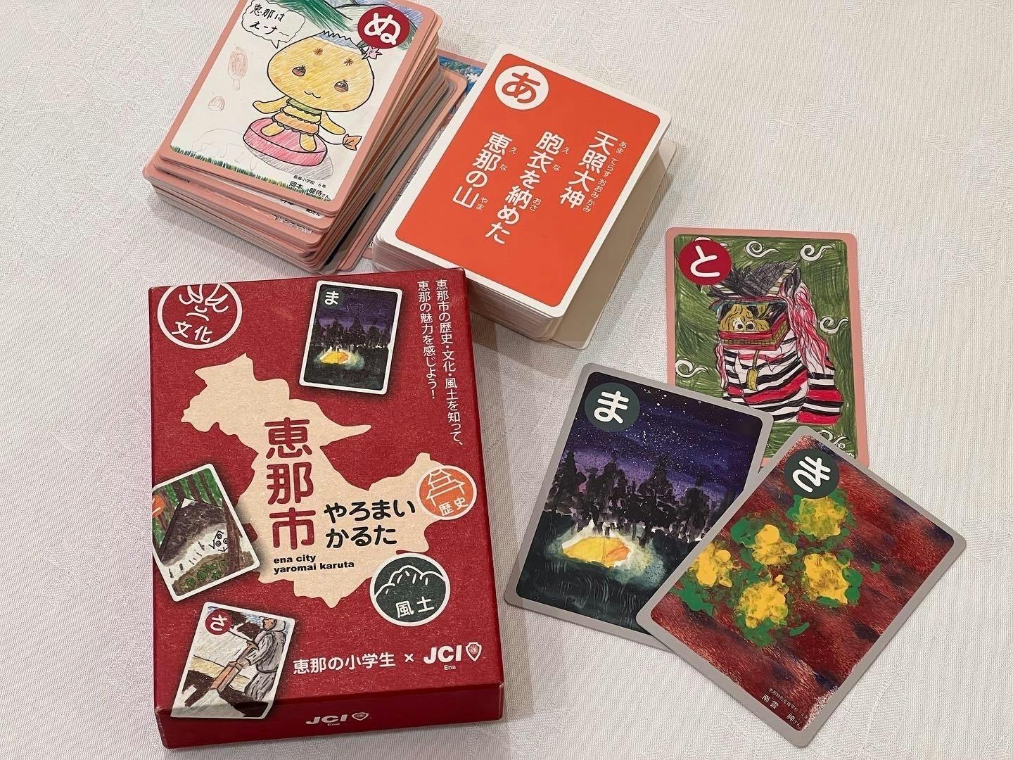 このカルタは恵那市の名産や景勝地、歴史的な建造物をカルタにしたものです。カルタの絵は地元恵那市内の小学生に書いてもらいました。現在は一社恵那市観光協会が引継ぎ、カルタ大会の実施などが行われています。