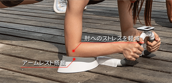 アームレスト付きで肘と床が接地せず、過度な負担をかけないように設計されています。それにより肘が痛くなることが苦手でトレーニングを続けられなかった方でも無理なく行うことができます。