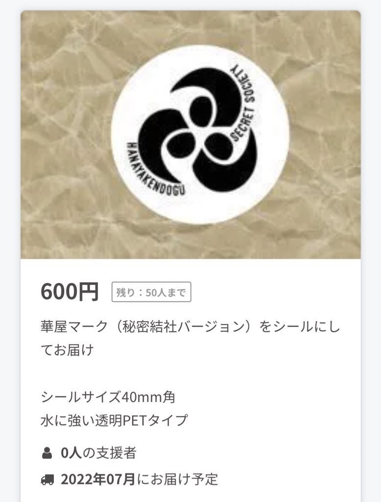 こんばんは(*^^*)いつもありがとうございます。なんと現時点で87%に到達!!夢がまた1歩…いや、2.30歩一気に進んでびっくりしています。あと僅か!!という事で新しいアイテム追加です。お手軽支援の華屋シールです(*゚▽゚)ノ(秘密結社バージョン)水に強いタイプですよー(´∇`)それからもうひとつ!消臭巾着も登場しております(*゚▽゚)ノ少しお高めですが、介護用品のメーカーさんが作られた巾着ですので、消臭効果はかなり高いとの事です。ぜひ防具袋に入れてお稽古に連れついってくださいね\(^o^)/ではあと約1週間よろしくお願いします♥(^^♪