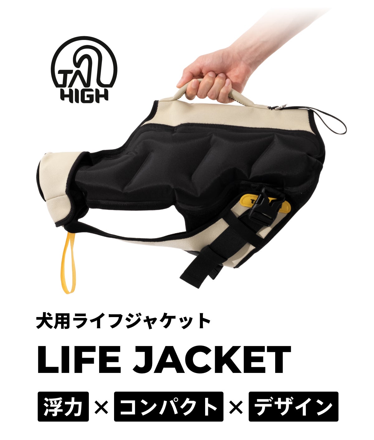 テールハイはこれらの課題を、ライフジャケットに空気を入れる革新的なデザインを採用することで全て解決することが出来ました。人向けのライフジャケットと同等の浮力を実現。また、使用後は空気を抜くことで持ち運びの快適性も格段に上げることができました。