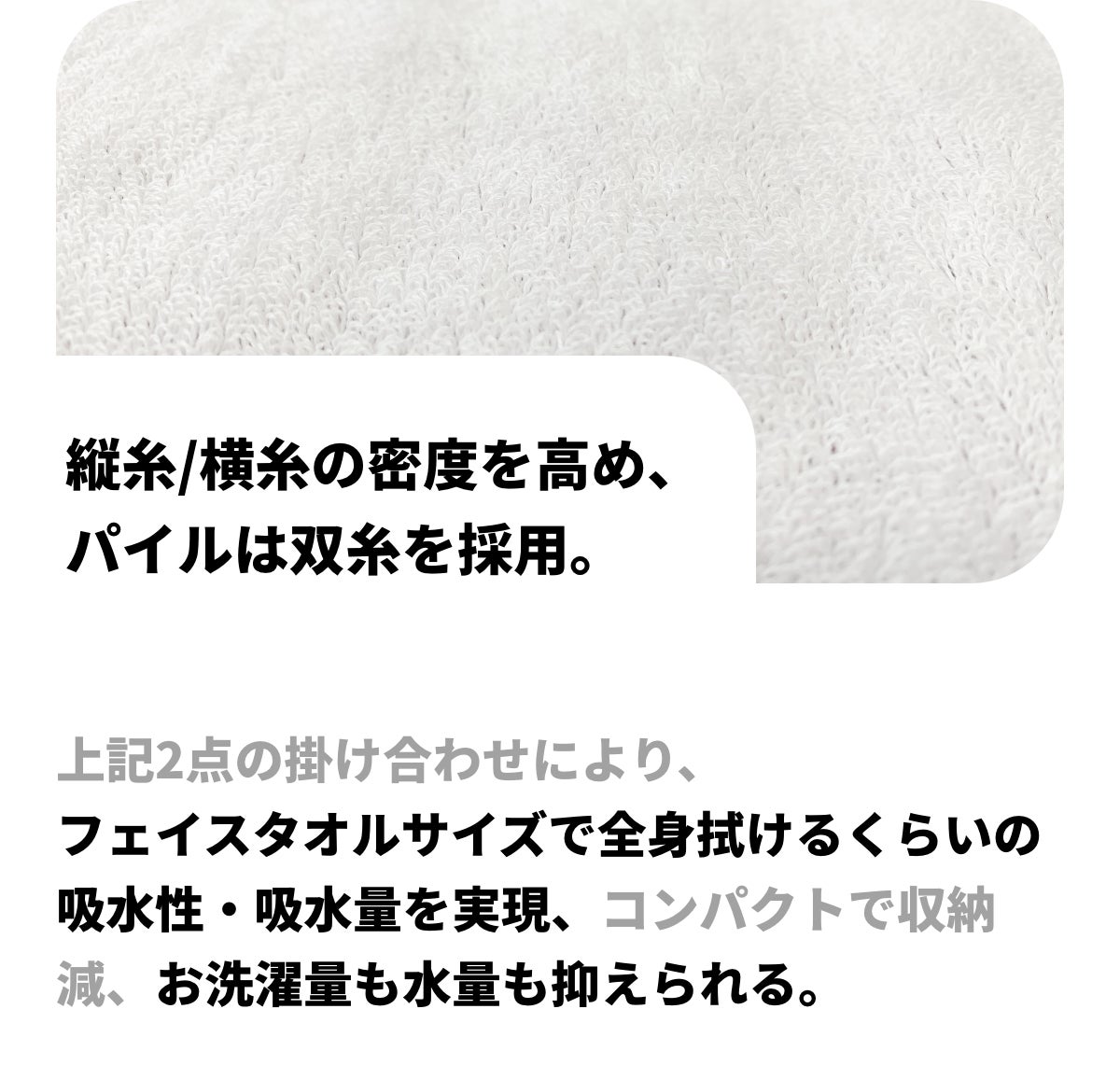 泉州タオルの一般的な規格と比べて縦糸/横糸どちらもかなり密度を高めた設定で、かつさらにボリューム感アップのためにパイルに双糸を採用、さらにタンブラー乾燥仕上げにすることでパイルが立ちふんわり感もアップ。