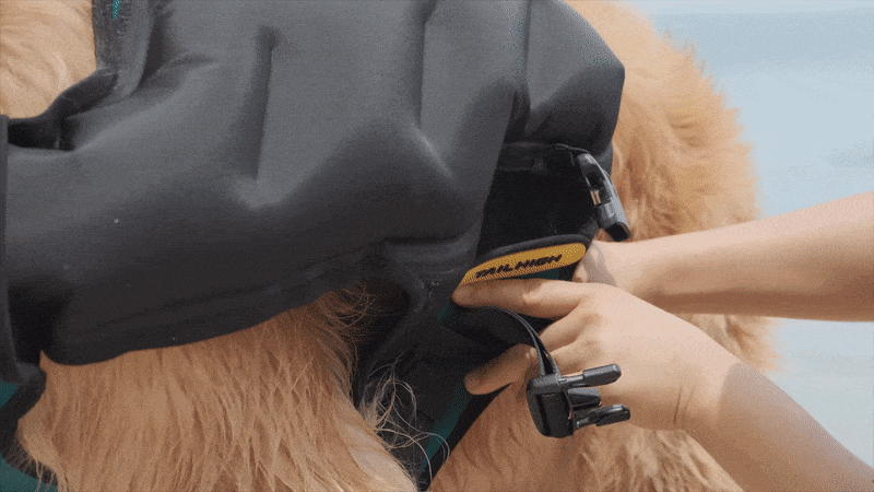 エアバッグ以外のパーツはウエットスーツに使われるネオプレン素材を使用。伸縮性、耐摩耗性、耐熱性、耐水性、耐候性、紫外線抵抗性に優れており、愛犬を保護し体温を維持します。