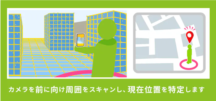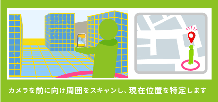 使いたいエリアに行ったらEYECANアプリを起動します。スマートフォンのカメラを前に向けることで、自動的にEYECANアプリが現在地を正確に特定します。