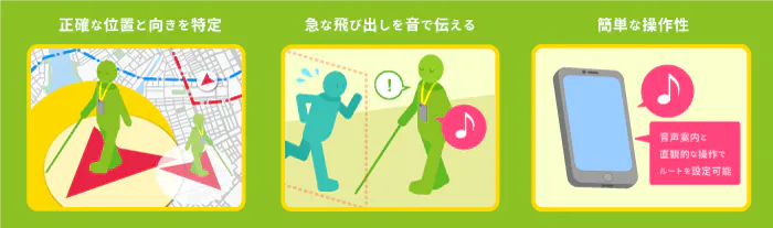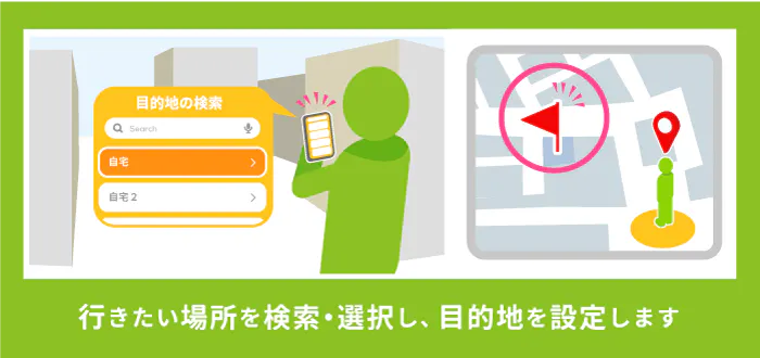ルートが自動で生成され、案内がスタートします。人や物体が近づくと音で知らせてくれるので、安心して目的地まで行くことができます。