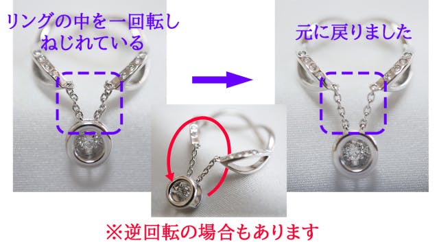 ●チェーンが絡まっているように見えることがありますが多くはリングの中を通って一回転しています。下図のように慌てずよく確認して元に戻してください。