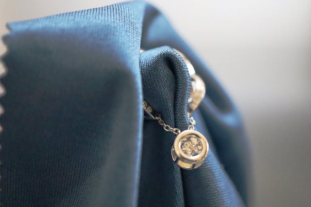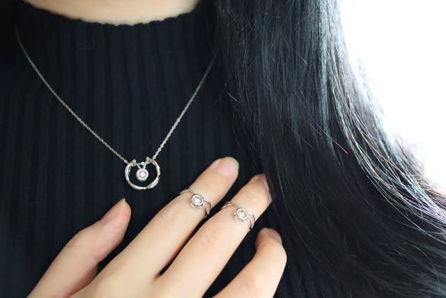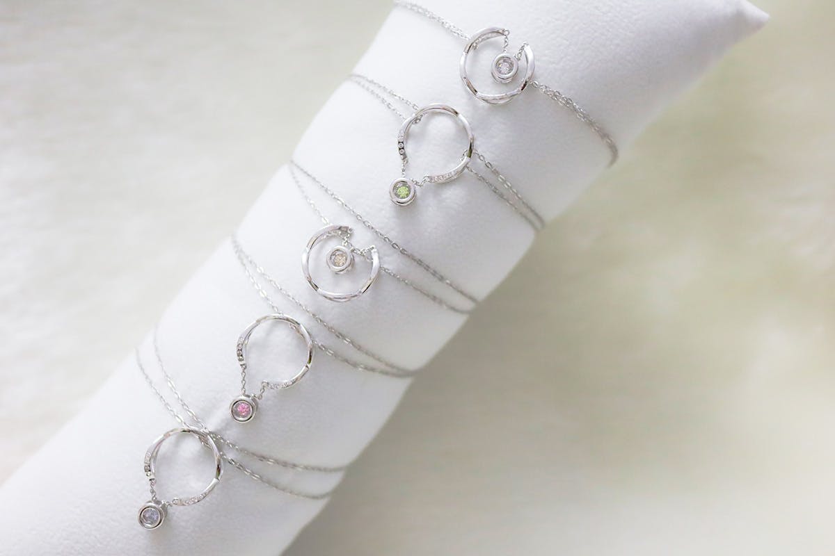 当ジュエリーは先にご案内した通り本ロジウムでメッキ加工がされているため、使用後のお手入れにはメガネ拭き等の柔らかい布で優しく皮脂などの汚れを拭き取ってください。どのアクセサリーにも共通して言えることですが、汚れをそのままにしてしまうと変色の原因となります。