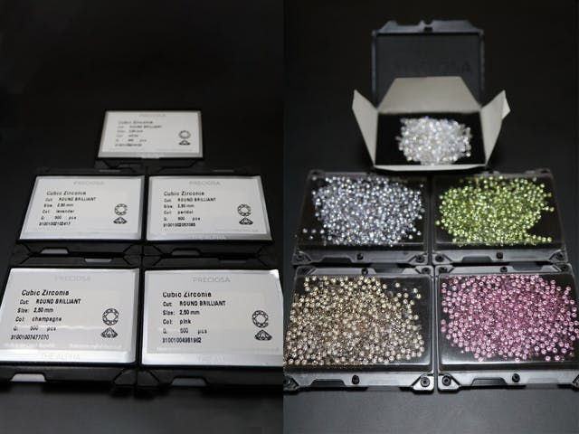 天然のダイヤモンドと違い内包物がないため透明度は素晴らしく・カット・色等、石材のクォリティー全て同じ!環境に優しくとても美しい人口石です。