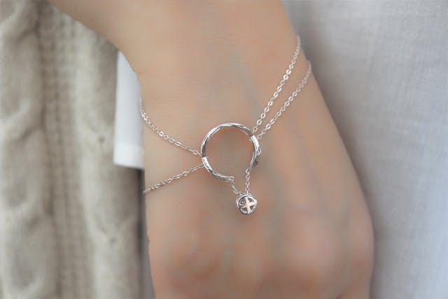 当初はピンキーリングの制作でしたが、指につけることが出来ない時にもこの幸運のリングをネックレスやブレスレット、時にはアンクレットとして、貴方の思いを忘れずいつでも身につけられるようデザイン。