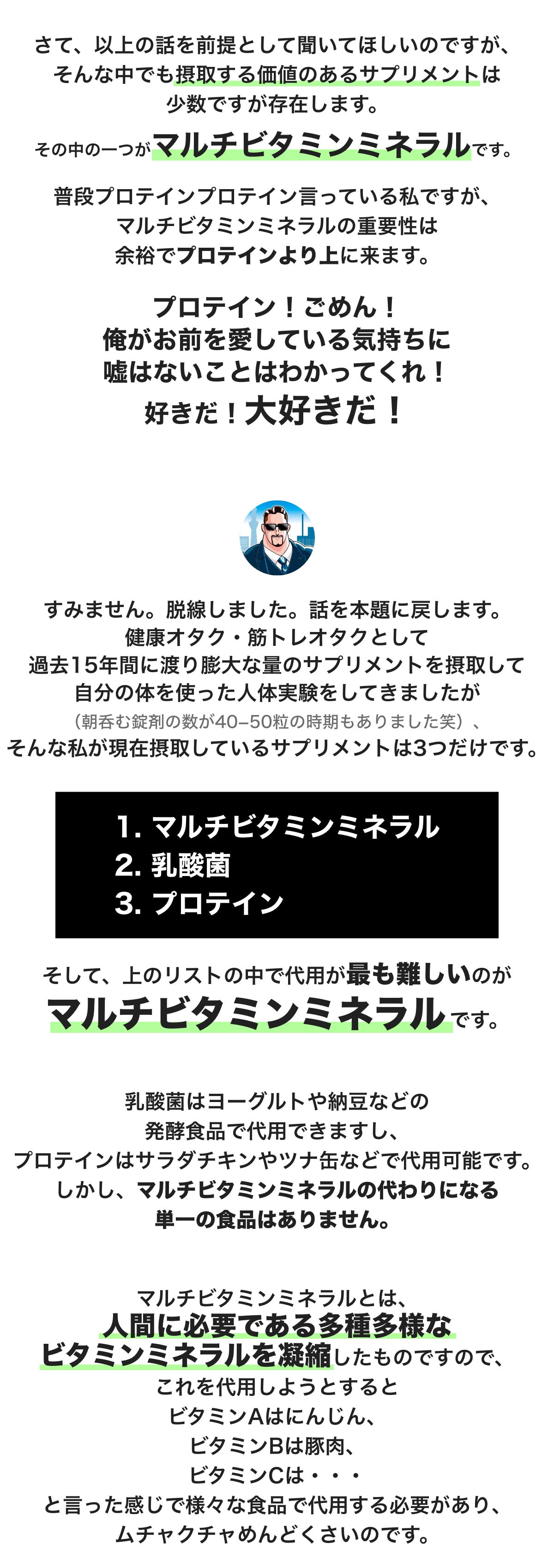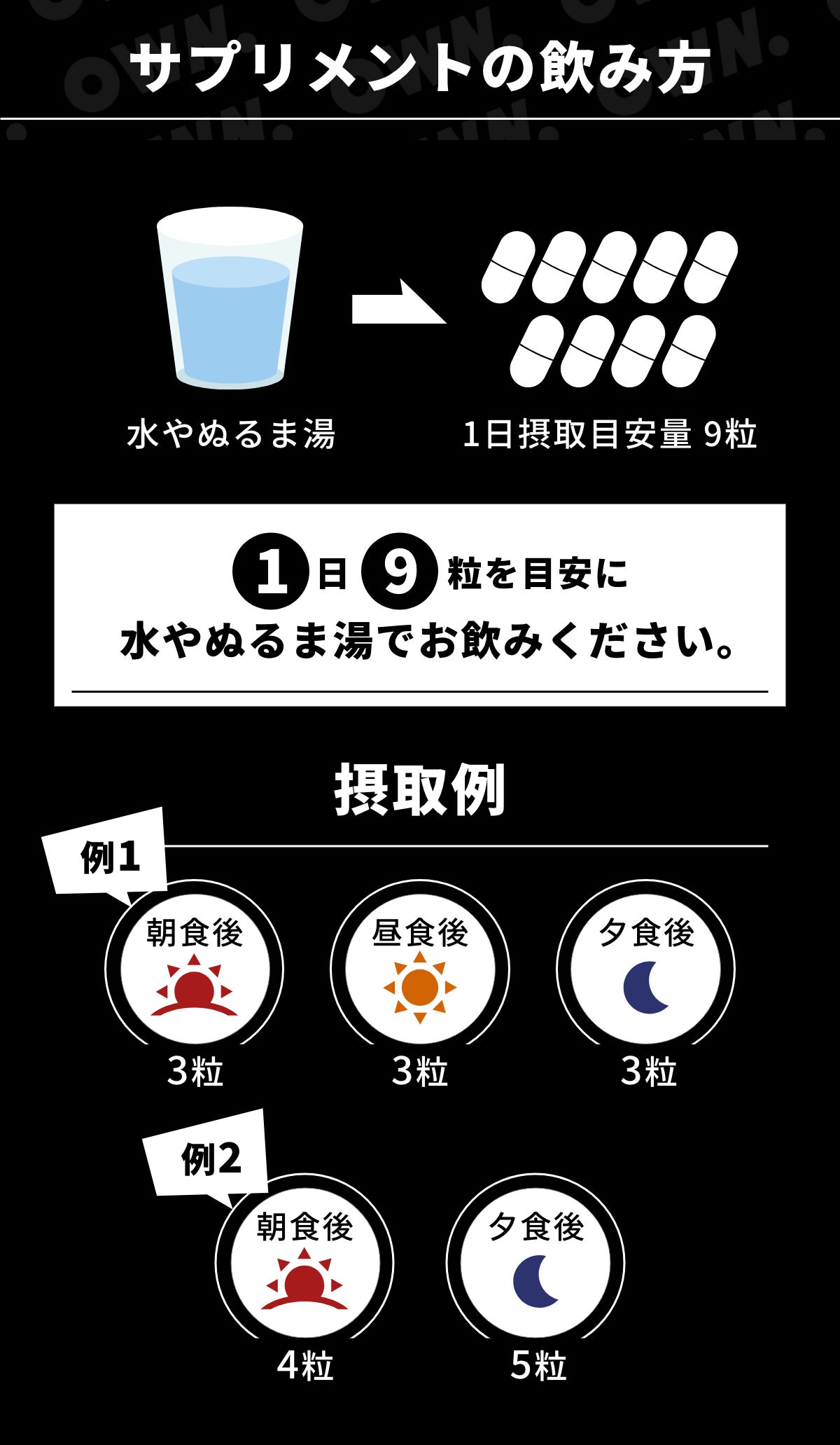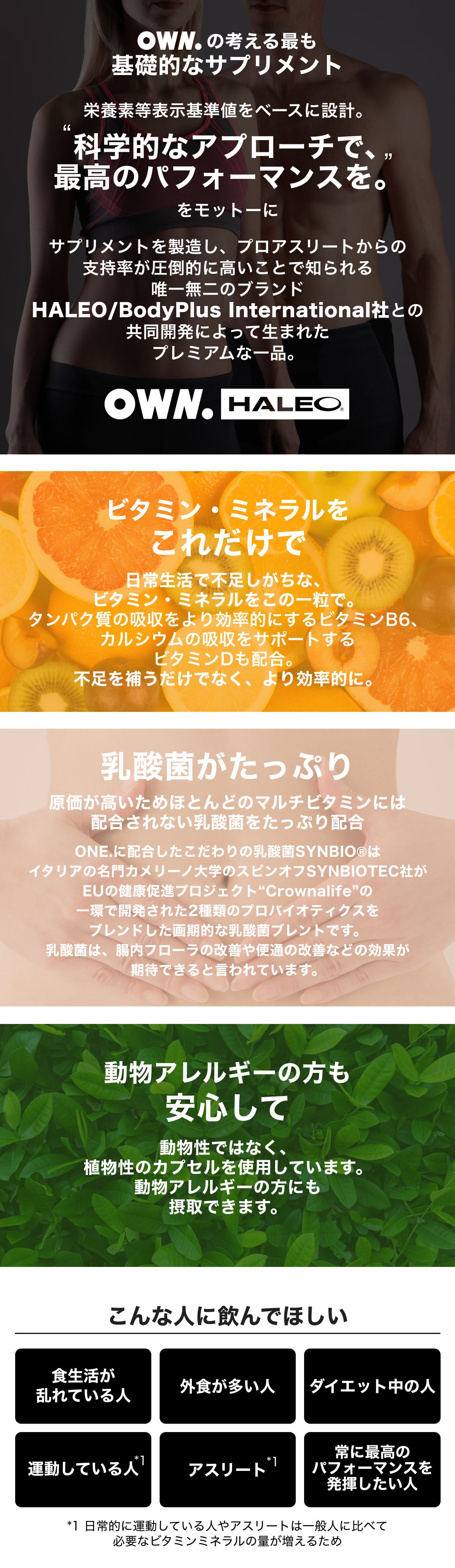 ・原材料名:乳酸菌(アメリカ製造、イタリア製造)、ダイダイ濃縮物、酵母、黒コショウエキス末/HPMC、結晶セルロース、加工デンプン、デュナリエラカロテン、トコトリエノール、ビタミンD3、(一部に乳成分・ゼラチン・オレンジを含む)