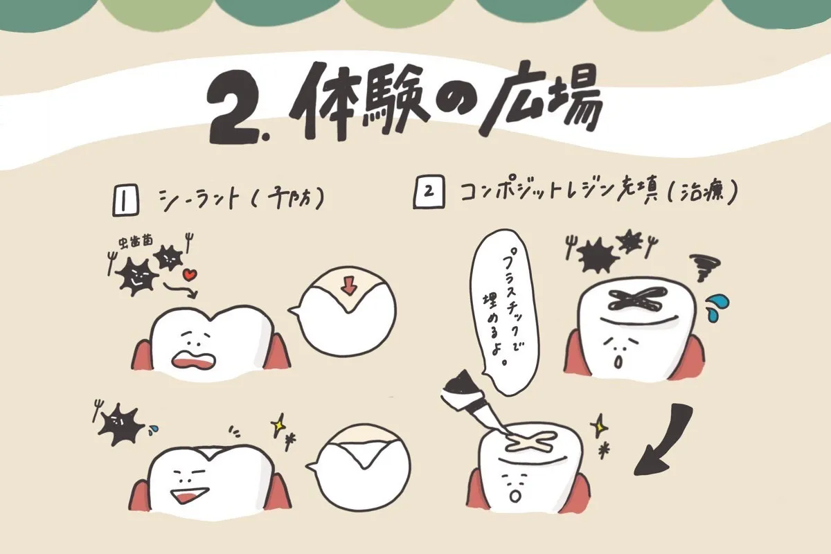 体験の広場では、歯医者さん体験を通して「予防と治療の違い」を体験します。