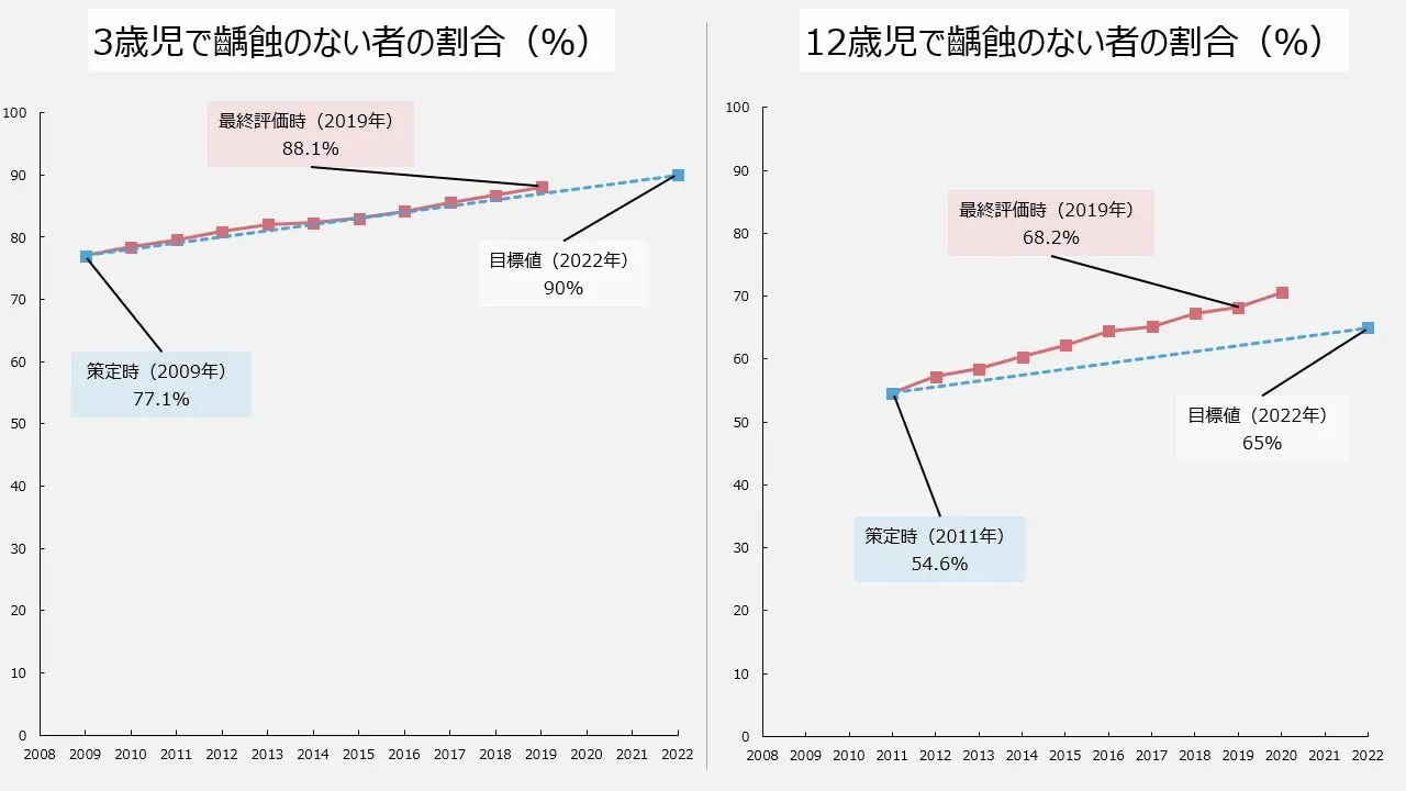 国が進めている健康施策「健康日本21」では、2022年度までに「3歳児で齲蝕のない者の割合の増加(90%)」「12歳児で齲蝕のない者の割合の増加(65%)」を目標にしています。学校歯科健診の結果によると、齲蝕のない者の割合は年々増加しており、これらの目標は既に達成、あるいは近い値まで到達しています[1]。