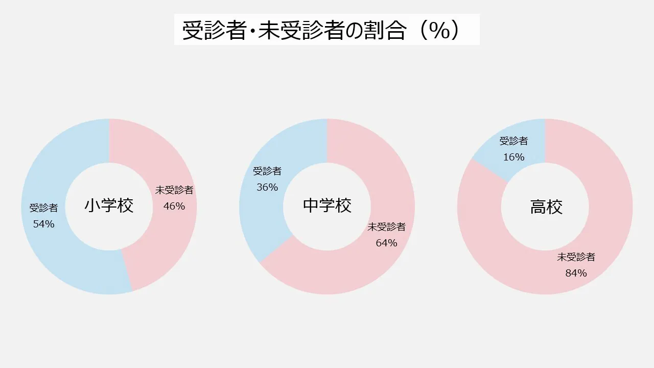 しかし、学校の歯科健診で歯科医院の受診を勧められた小学生のうち、実際には歯科医院に行っていない(未受診)生徒は46%にのぼることがわかっています。この「未受診率」は、中学生、高校生になるにつれ高くなっています(中学生:64%、高校生:84%)[2]。歯科的問題を抱えている子どもでさえ、これだけの割合が歯科医院を受診していないとなると、予防のために歯科医院に行く子どもは更に少ないことが容易に想像できます。
