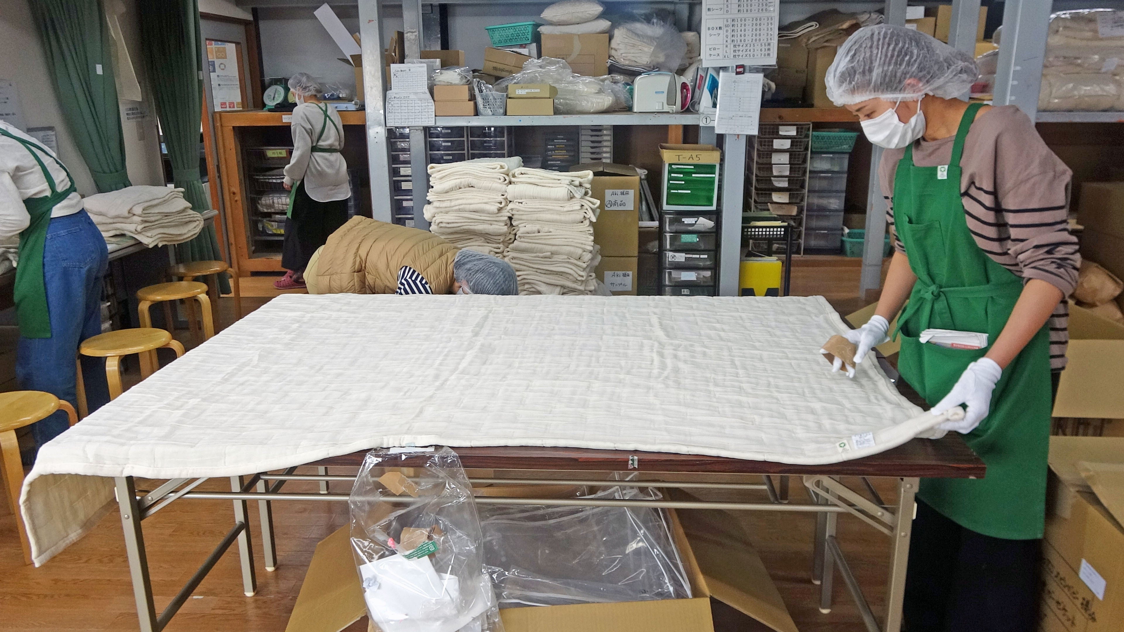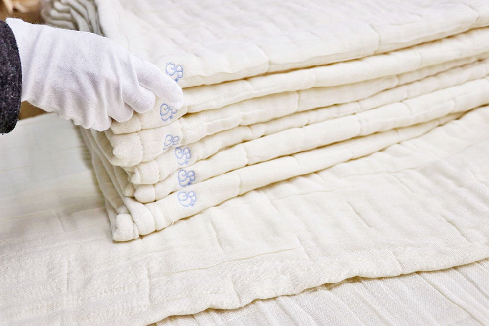 また、毎年オーガニック国際基準の検査を受け、合格した日本国内のオーガニック認定工場にて、織り工程から縫製、刺繍工程に至るまで、熟練の職人の手により、ひとつひとつ丁寧に製作しております。そのため、一日に製作できるのは10枚のみ。