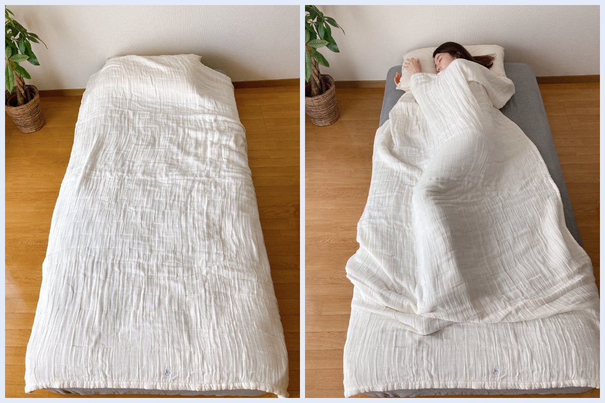 ・沖縄に住んでて蒸し暑い日も多いけど、暑すぎず寒すぎずめちゃくちゃいい心地で寝れます!娘と取り合いになるくらいいい肌触りで、毎日使わせてもらってまーす!(20代女性)
